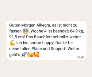 „Durch Allegra habe ich wieder zu einer Sportroutine gefunden und gelernt wie man sich auch gesund und kalorienarm ernähren kann ohne komplizierte Gerichte kochen zu müssen. Sie steckt sehr viel Herzblut und Wissen in ihre Arbeit und die Ernährungspläne so das man schnell Erfolge sieht. (-7kg) Zudem ist sie ein totaler Herzensmensch. Danke für Alles! (Ira Engels)